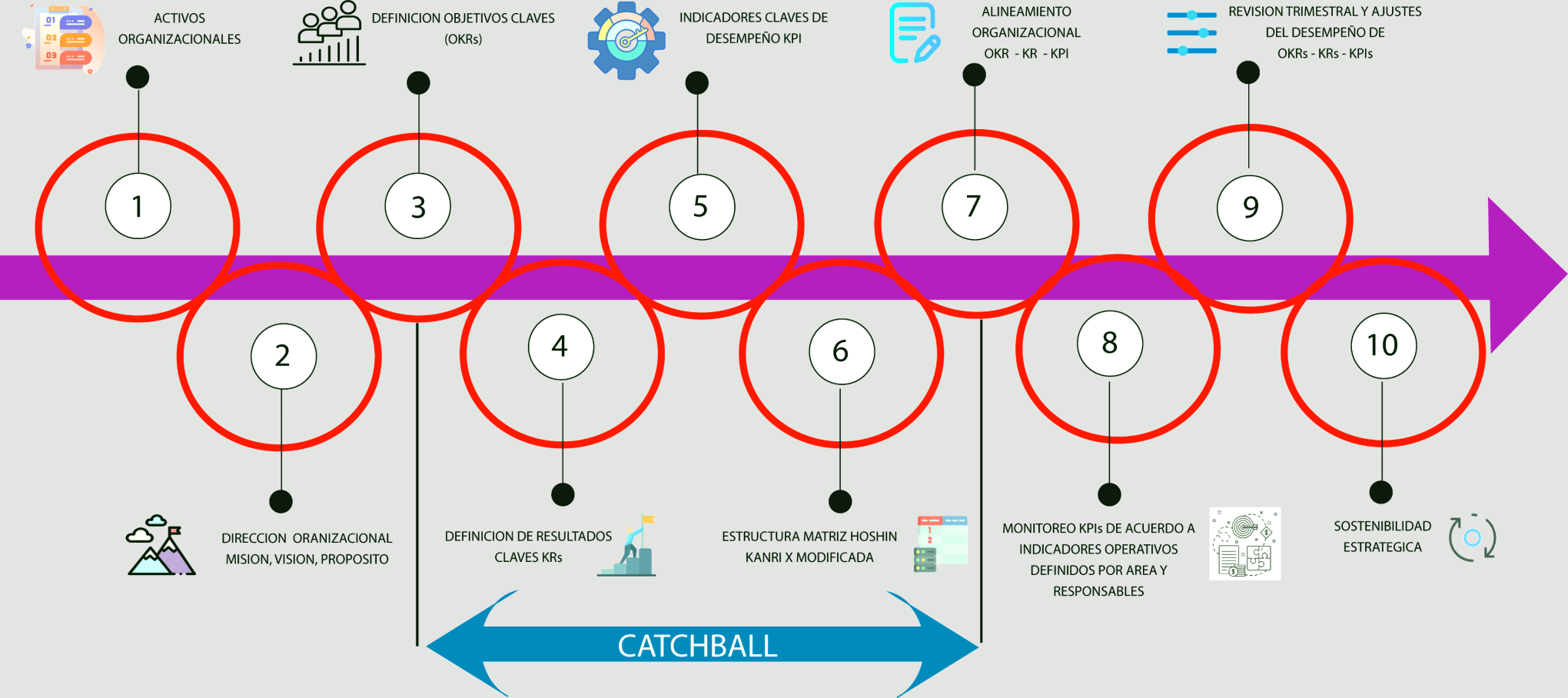 Implementamos la Matriz de Objetivos y Resultados OKR, usando las metodologías HOSHIN KANRI para la asignación las responsabilidades e indicadores.